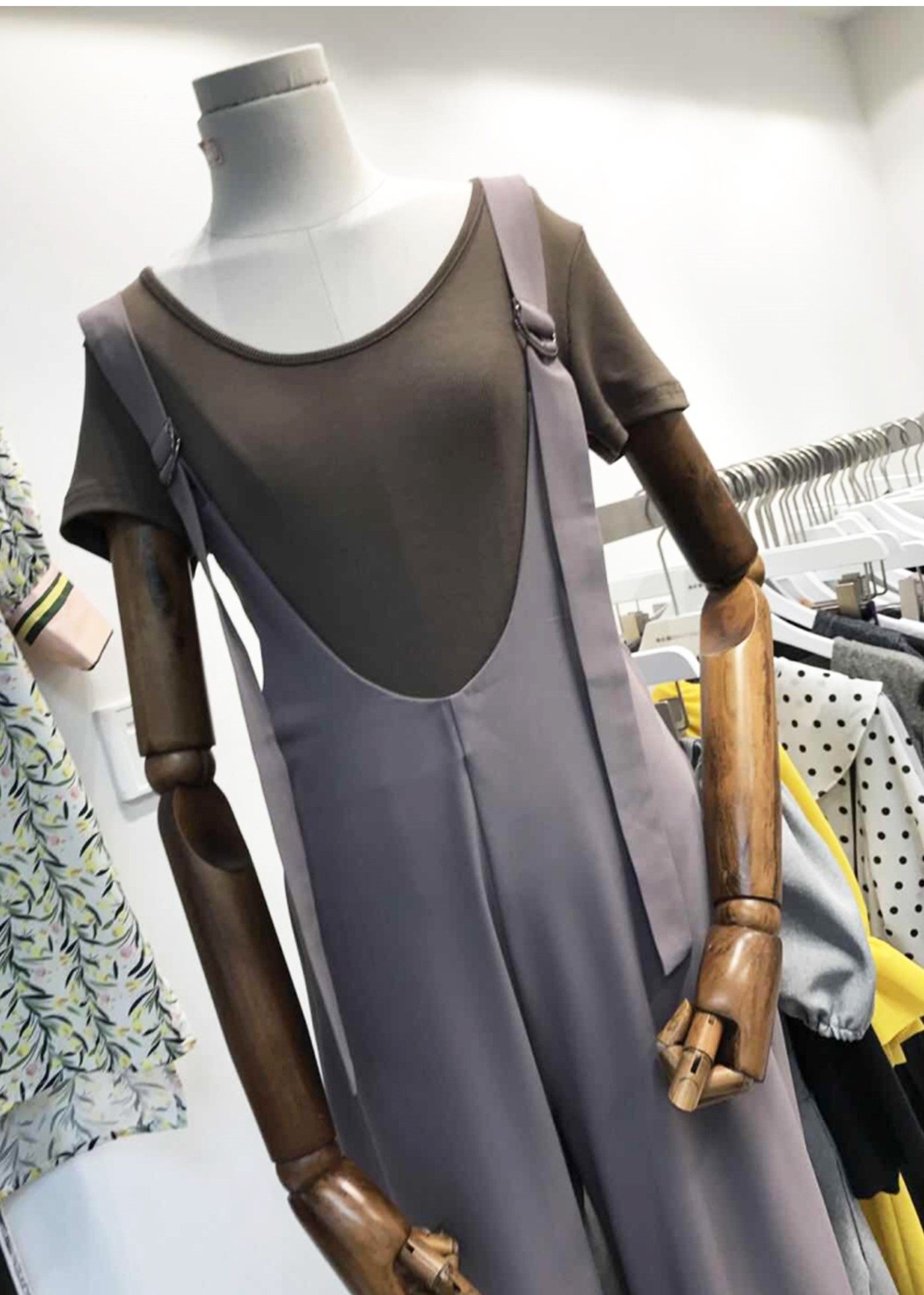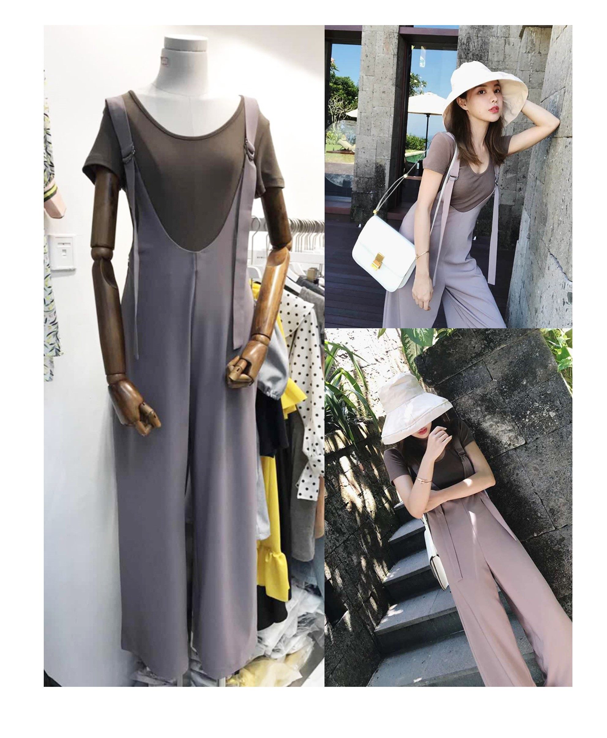 openlady V领宽松卡其色背带裤女 高腰直筒拖地阔腿裤夏 两种穿法